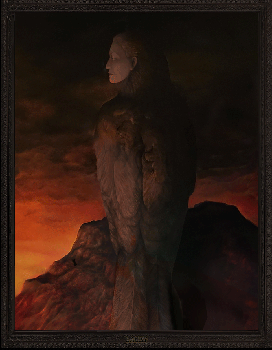 First conceived as a part of a series relating to folklore creatures from subculture mythology, the painting, Sinistra, pays homage to the Symbolist painting, Medusa, by Fernand Khnopff. This concept leads to a suite of paintings dedicated to winged deities. These new works are directed to incorporate the mythology of the ancient with the current human condition.