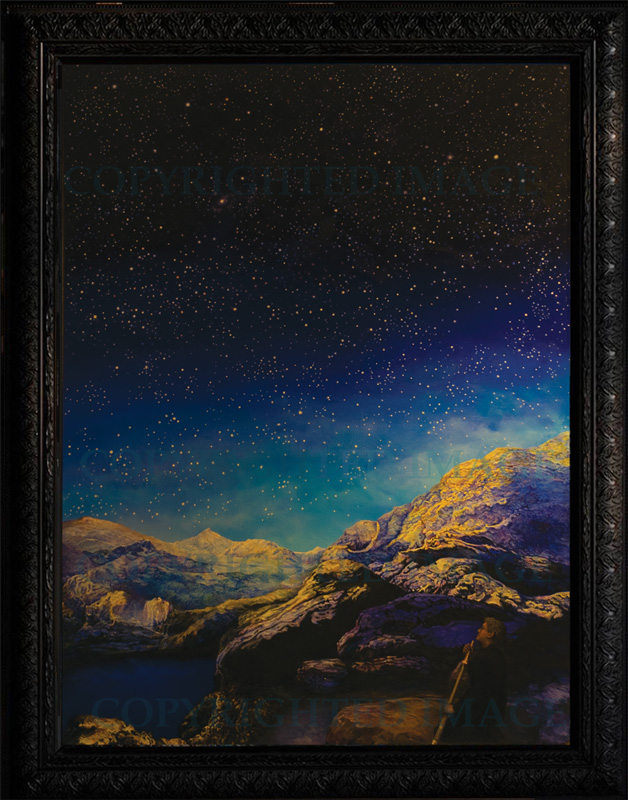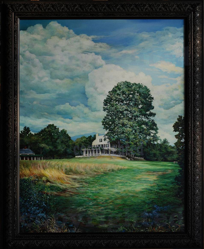 In these landscapes, colors are heightened and intensified. With a palette too intense to suggest a realistic view of the world, the colors create a world far more innocent and naive. Hyper-detail negates the possibility that the lands depicted by this artist are a dreamscape. Lacking is the hazy focus, atmosphere-laden quality associated with an idyllic dream vision. These paintings might best be assigned to the Magic Realist style deeply influenced by the Regionalist works of Thomas Hart Benton, Edward Hopper, Grant Wood, and the Regionalist landscapes of Maxfield Parrish. Maxfield Parrish created a perfected natural world in paintings like Hunt Farm. In 1914, he wrote in a letter to patron Gertrude Whitney:
